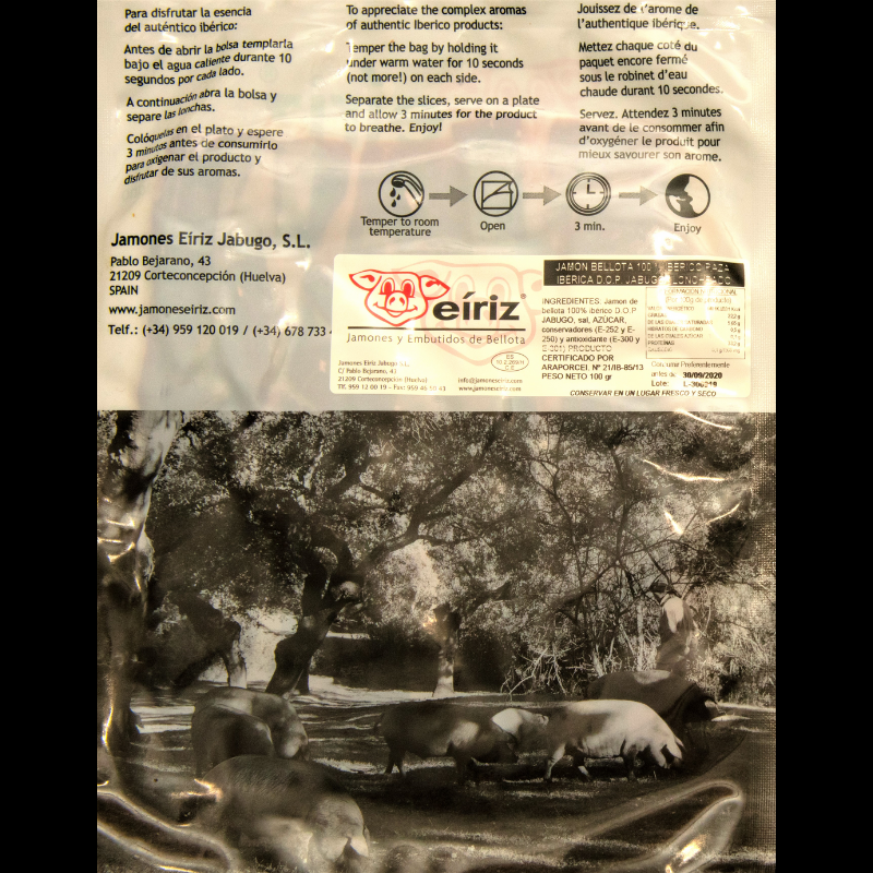 - Jamón de bellota 100 % ibérico DOP Jabugo loncheado a mano en paquetes 100 gr., 6 paquetes