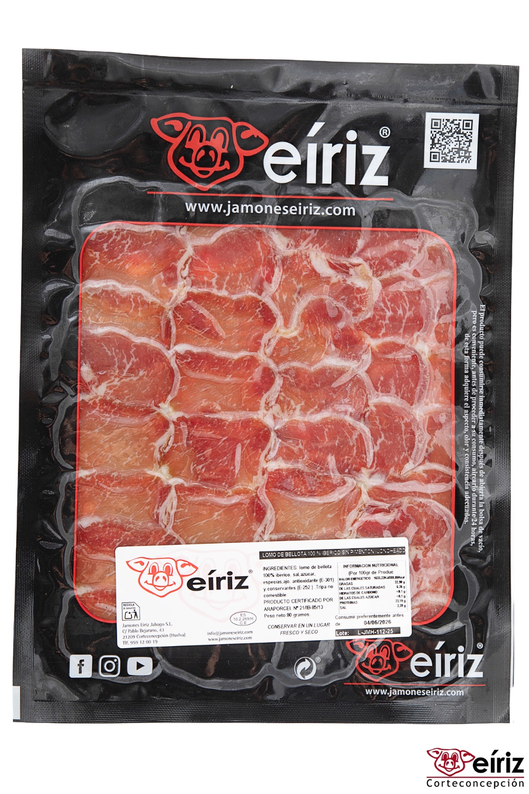Ingredientes: Lomo de bellota 100 % ibérico, sal, azúcar, especias, antioxidante E-301 y conservadores E-250 y E-252.